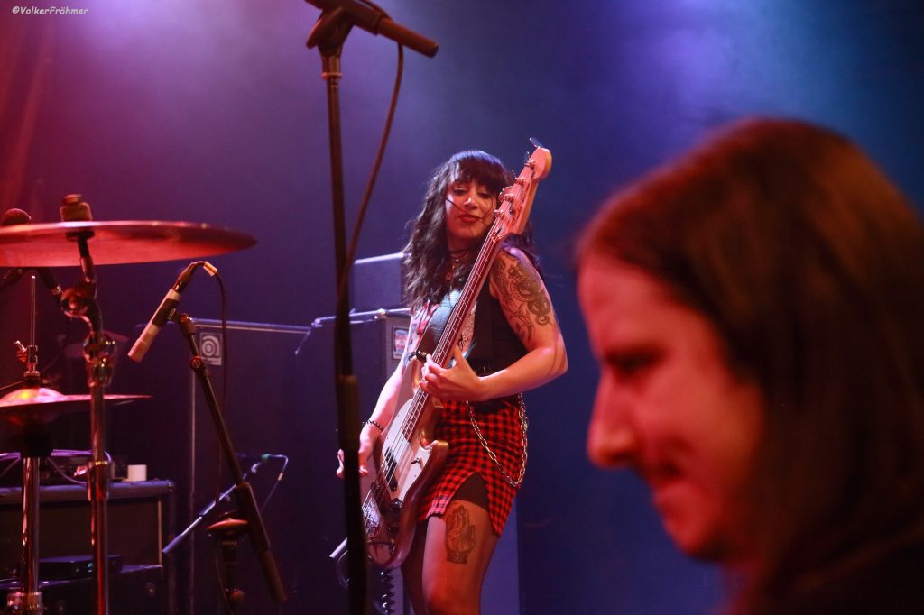 Um Punkt 20 Uhr grungten Daevar los und legten in den folgenden 60 Minuten, neben diversen Doom Durchschüttlern, eben Grungeattacken und auch kernigen HardRock unter unsere Sohlen und in die Nackengegenden. Moritz fachte mit seinem sehr präzisen Schlagwerk das Groovefeuer an und prügelte Dauerfeuer unter die Kompositionen. Pardis, der Sonnenschein der Band, fegte mit ihrem Bassspiel zusätzliche Luft in den Groove, der die gitarristischen Ausflüge von Caspar perfekt unterfütterte und zu einem großen Ganzen komplettierte. Die Texte, die Pardis vorträgt, erzählen u.a. viel über Frauenpower.